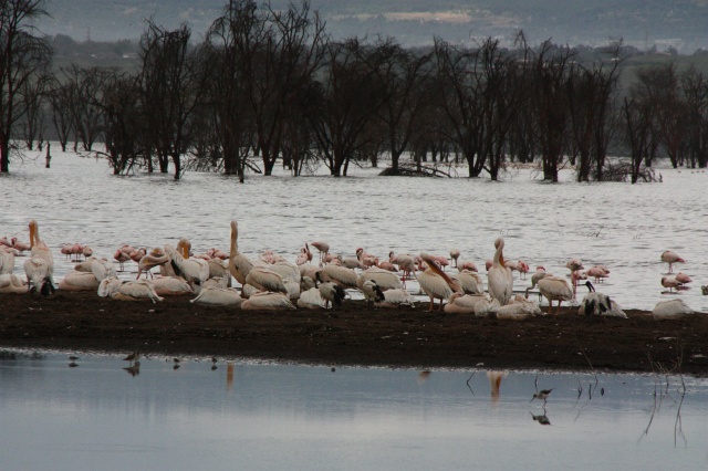Vom Hochwasser ersoffene Bäume und Pelikane